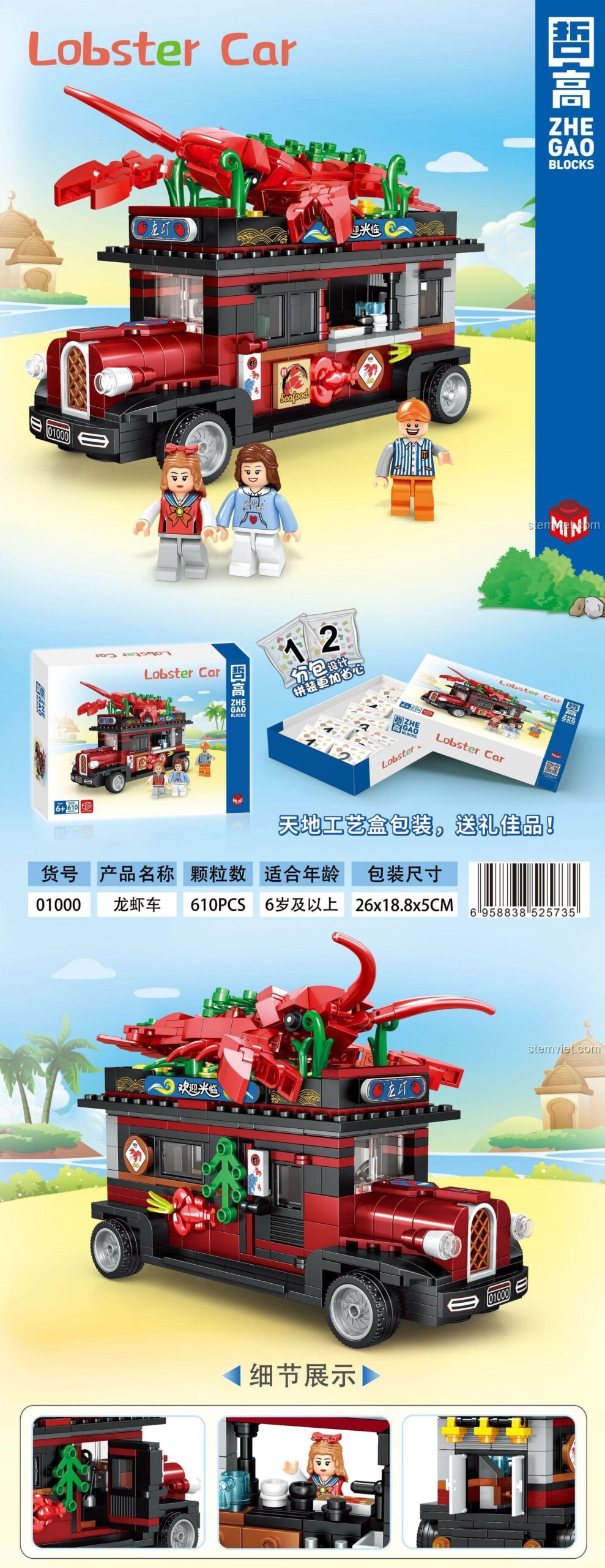 Ngay từ cái nhìn đầu tiên, bé sẽ bị thu hút bởi thiết kế vô cùng độc đáo và bắt mắt của chiếc xe. Mô hình mang đậm phong cách cổ điển, với tông màu đỏ và đen sang trọng, gợi nhớ đến những chiếc xe tải của thập niên cũ. Điểm nhấn không thể rời mắt chính là mô hình một chú tôm hùm khổng lồ, đỏ au, được đặt trang trọng trên nóc xe – một ‘biển hiệu’ không thể ấn tượng hơn! Từng chi tiết nhỏ như lưới tản nhiệt, đèn pha tròn, bánh xe đều được chăm chút tỉ mỉ, tạo nên một tổng thể hài hòa và chân thực. Bên trong xe là một không gian bán hàng thu nhỏ với đầy đủ ‘dụng cụ’ cần thiết, sẵn sàng cho bé nhập vai và sáng tạo những câu chuyện kinh doanh thú vị. Với 610 mảnh ghép mini block, đây là một thử thách vừa phải, giúp bé rèn luyện sự kiên nhẫn và tập trung cao độ.