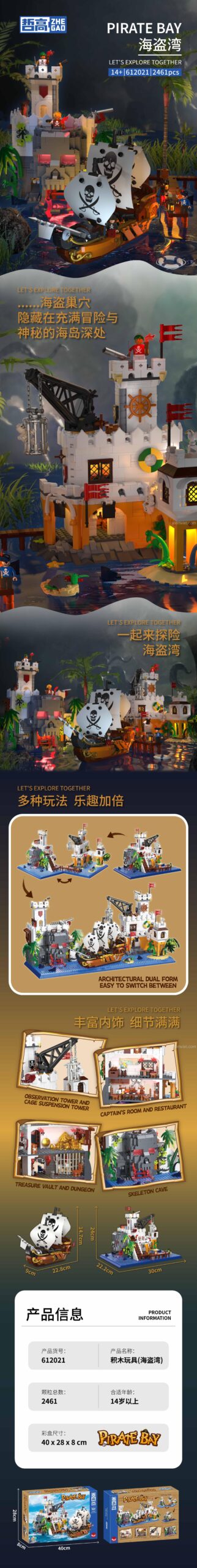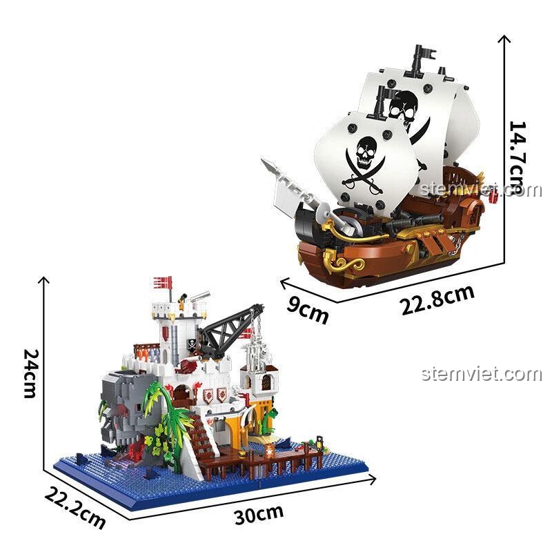 Sự hoành tráng của đồ chơi mô hình ZHEGAO 612021 nằm ở quy mô và độ chi tiết đáng kinh ngạc. Với kích thước tổng thể lên tới 30 x 22.2 x 24 cm, đây là một sa bàn thực thụ, một tác phẩm nghệ thuật đầy ấn tượng. Toàn bộ Vịnh Hải Tặc được chia thành hai khu vực chính: pháo đài kiên cố và chiếc tàu hải tặc dũng mãnh.
