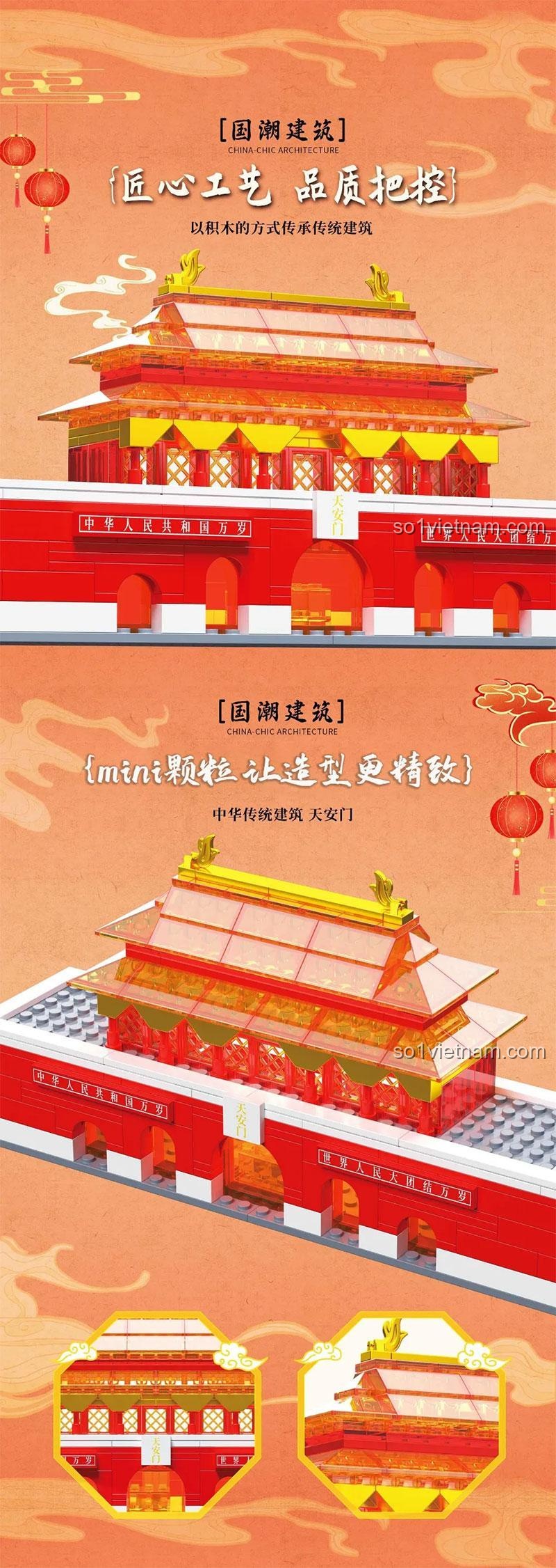 Điểm đặc biệt làm nên sự cuốn hút của đồ chơi mô hình Cổng Thiên An Môn chính là việc sử dụng các hạt mini block siêu nhỏ. Nhờ vậy, từng chi tiết của công trình kiến trúc vĩ đại này được tái hiện một cách đáng kinh ngạc. Từ mái ngói lưu ly màu vàng óng, tượng trưng cho hoàng gia, đến những bức tường thành màu đỏ son uy nghiêm và những chi tiết trang trí tinh xảo, tất cả đều được thể hiện một cách chân thực. Với kích thước sau khi hoàn thành là 19.2 x 5 x 10.5 cm, mô hình có tỷ lệ cân đối, hoàn hảo để trưng bày trên bàn học hay kệ sách của bé. Quá trình lắp ráp sẽ giúp bé rèn luyện sự tỉ mỉ và cảm nhận được vẻ đẹp của kiến trúc cổ điển, một trải nghiệm thẩm mỹ vô cùng quý giá.
