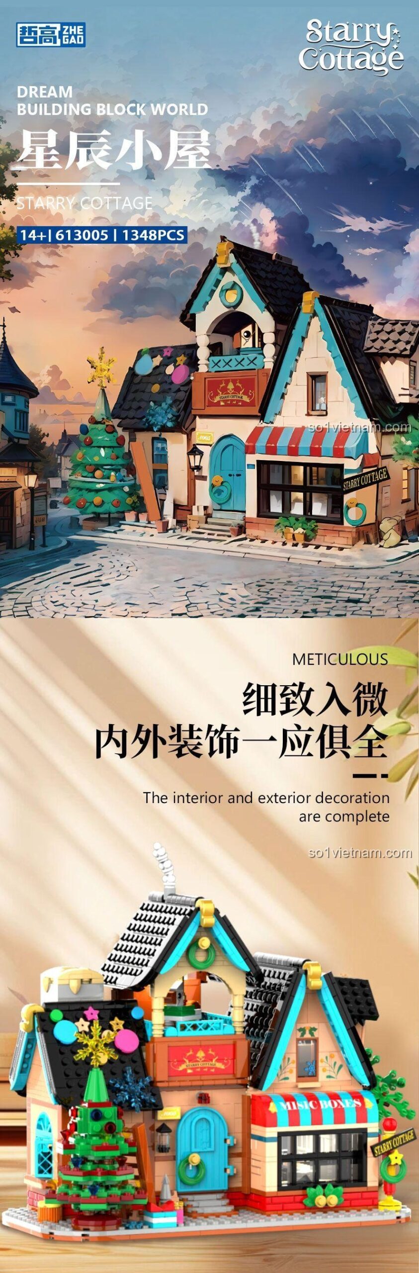 Bạn có bao giờ mơ về một ngôi nhà nhỏ xinh xắn, nép mình trong một con phố châu Âu cổ kính, nơi không khí Giáng Sinh ấm áp tràn ngập mọi ngóc ngách? Nơi mà mỗi ô cửa sổ đều lấp lánh ánh đèn, và những giai điệu du dương từ những chiếc hộp nhạc cổ điển vang lên? Với bộ lắp ghép Ngôi Nhà Tinh Tú ZHEGAO 613005, giấc mơ ấy không còn xa vời. Đây không chỉ là một bộ đồ chơi lắp ráp thông thường, mà là một tấm vé mời bạn, một cô gái 14 tuổi đầy mộng mơ, bước vào hành trình kiến tạo nên thế giới cổ tích của riêng mình. Từ 1348 mảnh ghép nhỏ bé, một công trình kiến trúc đầy mê hoặc sẽ dần hiện ra, mang theo câu chuyện về một cửa hàng hộp nhạc diệu kỳ, nơi những vì sao dường như có thể chạm tới. Hãy cùng khám phá câu chuyện đằng sau từng viên gạch, và để trí tưởng tượng của bạn bay cao, bay xa cùng Ngôi Nhà Tinh Tú.