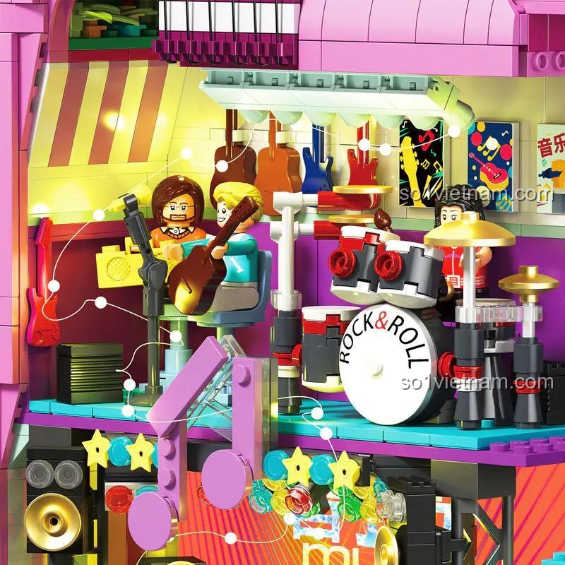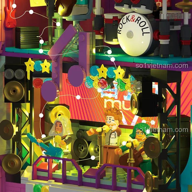 • Sân khấu nhạc sống động: Bên trong thân đàn là một sân khấu thu nhỏ với đầy đủ nhạc cụ và minifigure.