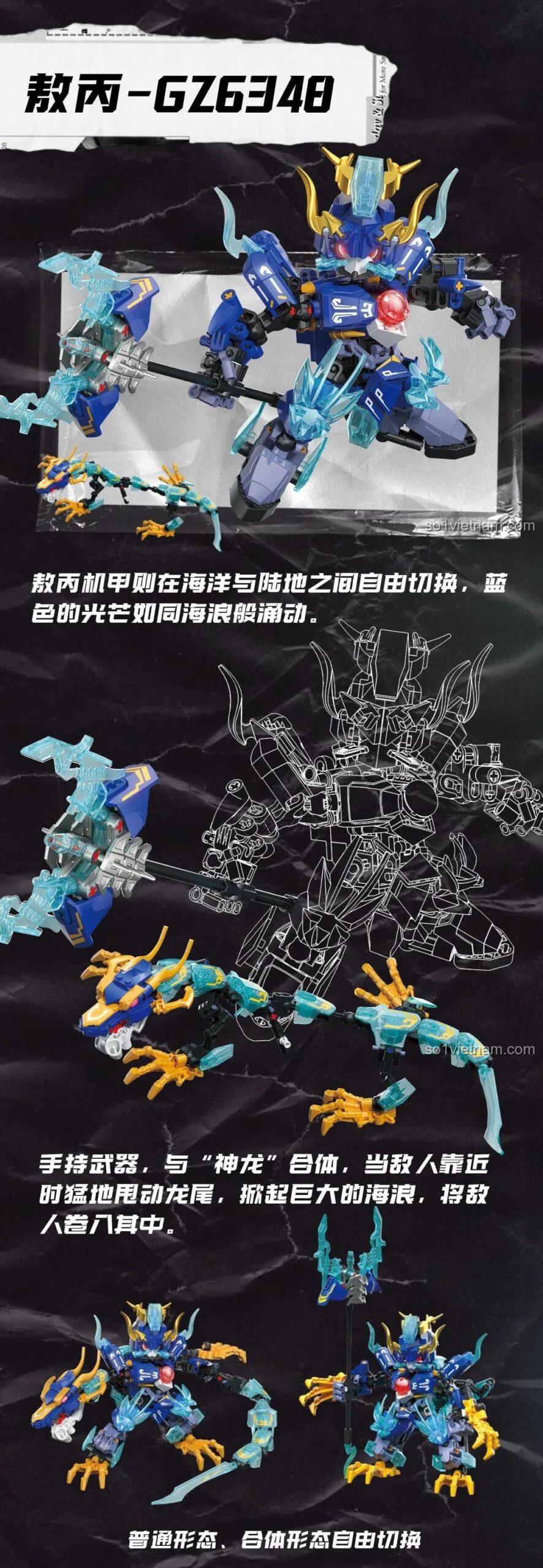 Ngay từ cái nhìn đầu tiên, đồ chơi mô hình ZHEGAO GZ6348 đã chinh phục mọi ánh nhìn bởi thiết kế quá đỗi ấn tượng. Khoác lên mình bộ giáp cơ khí với tông màu xanh dương của biển cả làm chủ đạo, điểm xuyết bằng những chi tiết vàng kim vương giả, Mecha Ngao Bính toát lên vẻ uy nghi của một vị hoàng tử và sự mạnh mẽ của một chiến binh. Từng đường nét trên bộ giáp, từ chiếc mũ trụ hình đầu rồng đến những tấm khiên vai sắc lẹm, đều được chế tác tỉ mỉ. Đặc biệt, các chi tiết bằng nhựa trong suốt màu xanh lơ mô phỏng hiệu ứng sức mạnh thủy tộc và những con sóng cuộn trào, tạo nên một tổng thể sống động như thật. Với kích thước sau khi hoàn thiện lên tới 30cm chiều dài, 17cm chiều rộng và 17cm chiều cao, mô hình Ngao Bính Giáp Long GZ 6348 thực sự là một tác phẩm nghệ thuật cơ khí, một món đồ trang trí cực ngầu trong phòng của bé, khẳng định cá tính và niềm đam mê của một “nhà lắp ráp” nhí thực thụ.