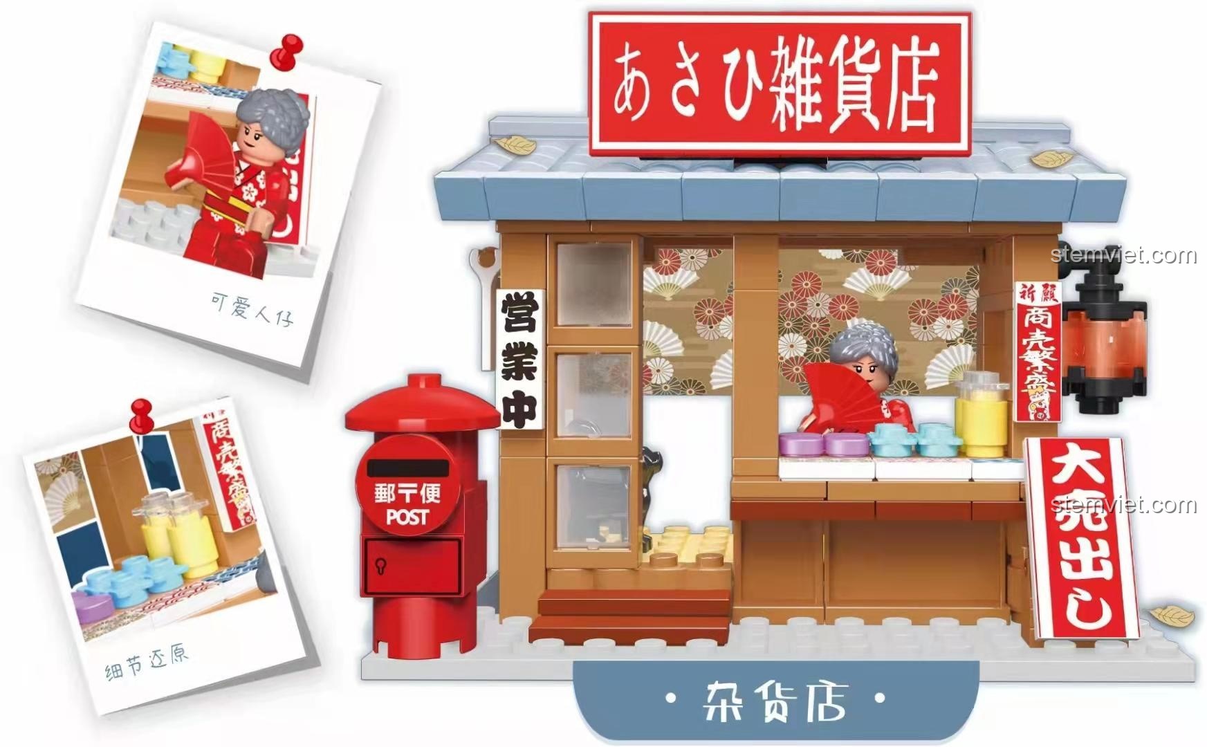 Vẻ đẹp của đồ chơi mô hình JZ3001-5 nằm ở sự tinh tế và chân thực đến không ngờ. Với tông màu chủ đạo là nâu gỗ ấm áp, kết hợp với mái hiên xanh dương thanh bình và điểm nhấn màu đỏ từ chiếc hòm thư cổ điển, mô hình mang lại một cảm giác vô cùng hoài niệm. Kích thước sau khi hoàn thành vào khoảng 14x8x12 cm, một kích thước hoàn hảo để trưng bày trên bàn học hay kệ sách của bé. Mọi chi tiết đều được chăm chút tỉ mỉ: từ tấm biển hiệu “あさひ雑貨店” (Cửa hàng tạp hóa Asahi), tấm rèm noren truyền thống, những món hàng nhỏ xinh được bày bán, cho đến cả minifigure bà chủ tiệm với chiếc quạt giấy trên tay. Tất cả cùng nhau tạo nên một sa bàn sống động, một tác phẩm nghệ thuật thu nhỏ mà chính tay bé đã tạo ra, giúp con rèn luyện óc quan sát và cảm nhận thẩm mỹ một cách tự nhiên nhất.