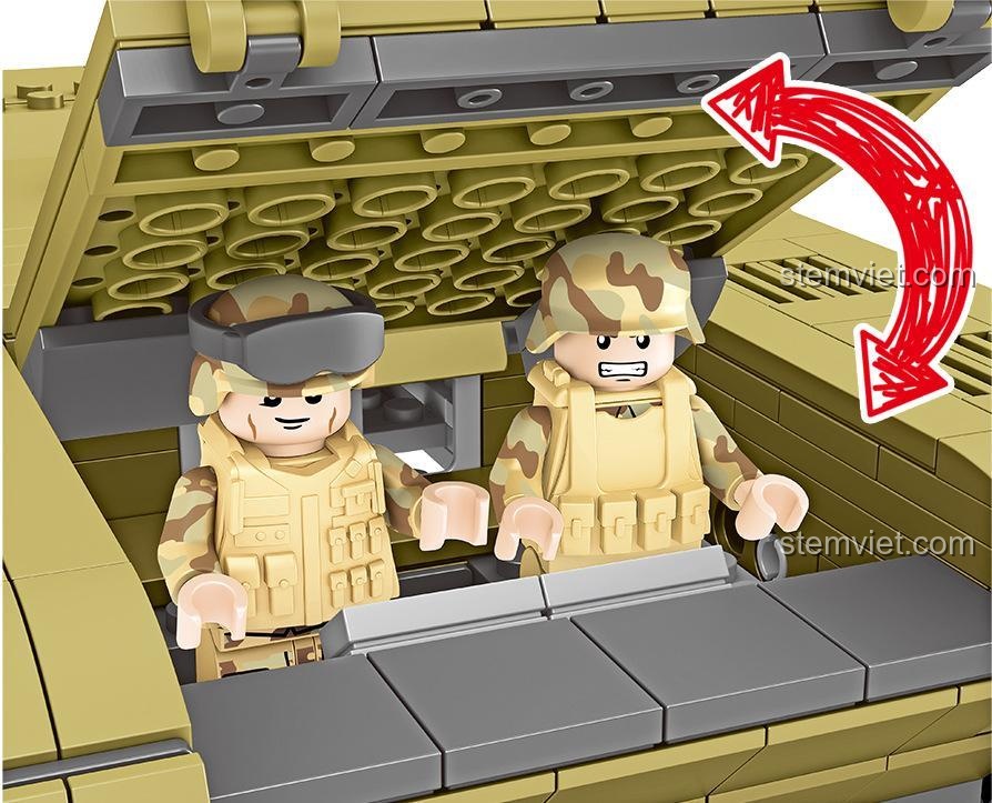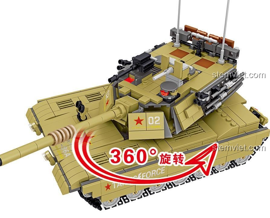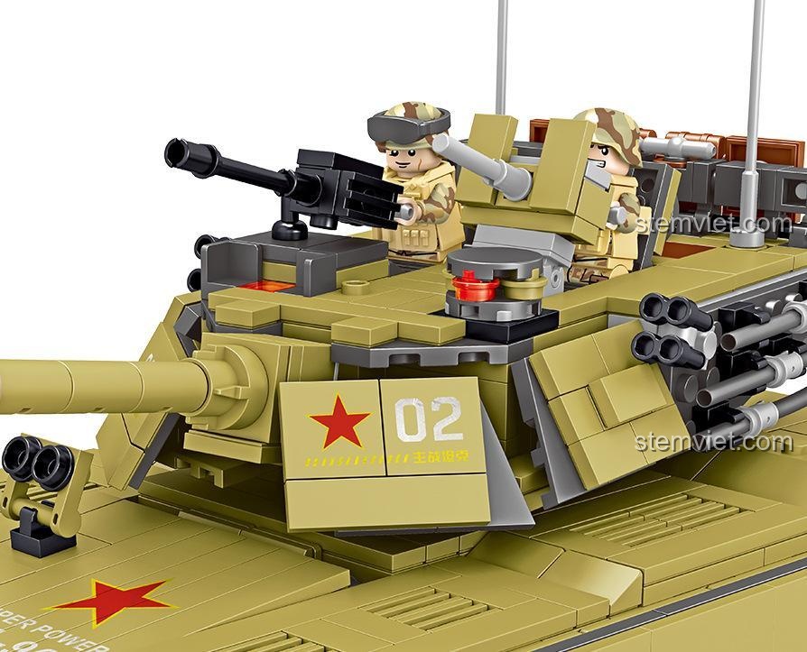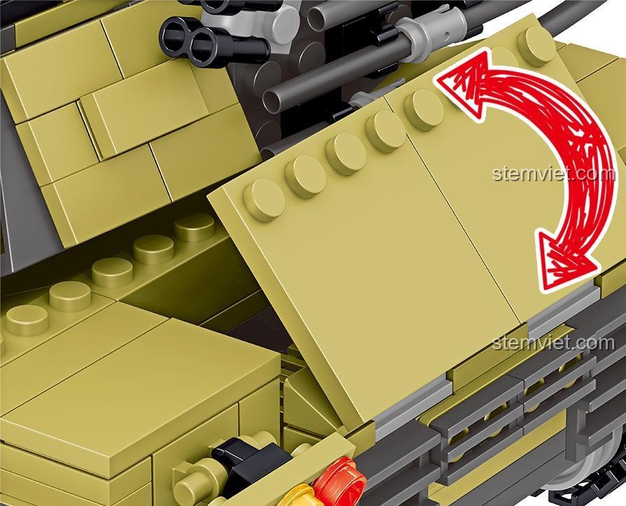 Điều làm nên sự khác biệt của Xe tăng chiến đấu chủ lực Type 96A ZHEGAO không chỉ nằm ở vẻ ngoài mà còn ở các tính năng tương tác hấp dẫn. Bé sẽ vô cùng thích thú khi biết rằng tháp pháo của xe tăng có thể xoay tròn 360 độ, cho phép ngắm bắn mục tiêu từ mọi hướng. Nòng pháo chính cũng có thể nâng lên hạ xuống linh hoạt. Hệ thống xích xe được thiết kế để di chuyển trơn tru trên nhiều bề mặt, tạo cảm giác như một chiếc xe tăng thật đang lăn bánh. Hơn nữa, nhiều nắp khoang trên thân xe và tháp pháo có thể mở ra, để lộ không gian bên trong cho các minifigure điều khiển. Những tính năng này không chỉ làm tăng giá trị chơi mà còn giúp bé hiểu rõ hơn về cấu tạo và cách vận hành của một cỗ máy chiến đấu thực thụ.