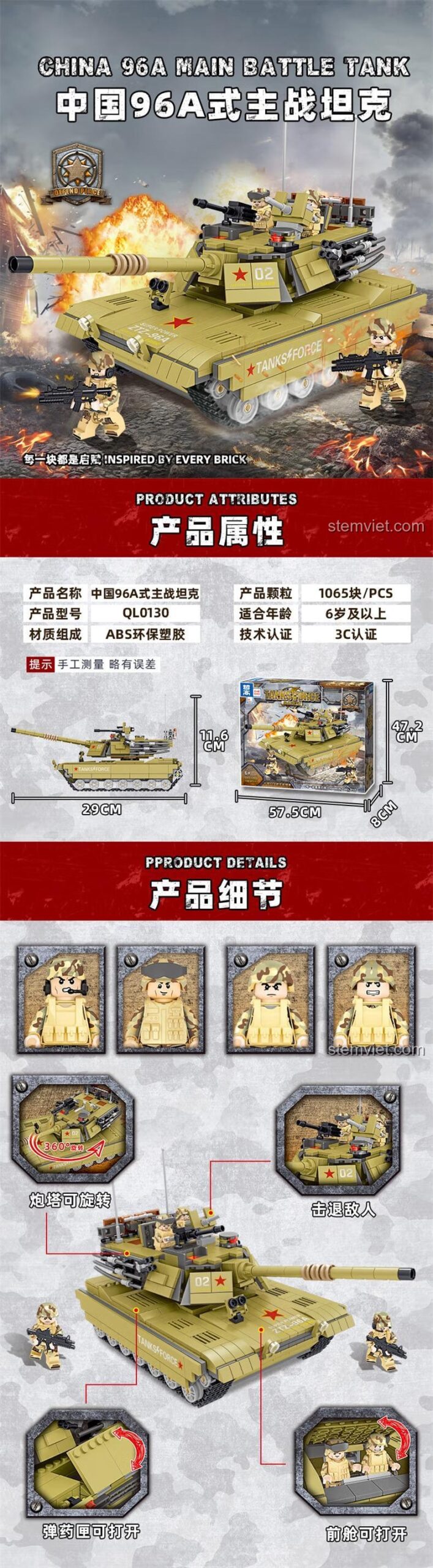 Mô hình Xe tăng Type 96A QL0130 có rất nhiều tính năng thú vị! Tháp pháo có thể xoay 360 độ, nòng pháo nâng lên hạ xuống được, xích xe di chuyển linh hoạt và các cửa khoang có thể mở ra để đặt minifigure vào bên trong.
