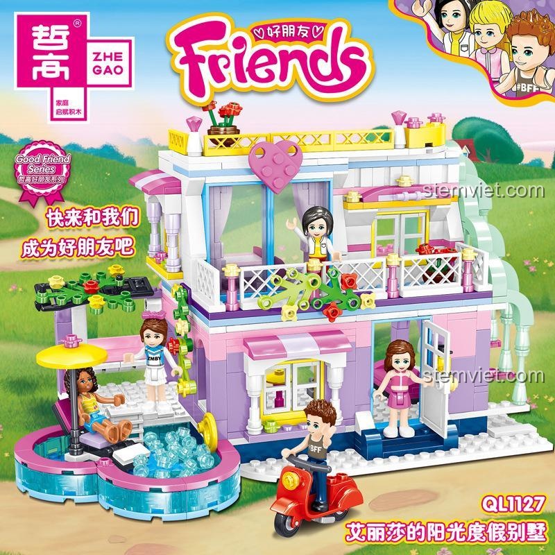 Mang cả một kỳ nghỉ hè ngập nắng về cho bé gái với bộ lắp ráp ZHEGAO QL1127 Biệt Thự Nghỉ Dưỡng của Alisa! Với 586 mảnh ghép màu sắc ngọt ngào, bé sẽ tự tay xây dựng nên một căn biệt thự 2 tầng lộng lẫy, có cả hồ bơi trong xanh và sân thượng sôi động. Bộ sản phẩm đi kèm 5 nhân vật bạn thân và một chiếc scooter sành điệu, mở ra vô vàn câu chuyện tình bạn thú vị. Được làm từ nhựa ABS an toàn, chất lượng tương đương LEGO® nhưng giá lại siêu tiết kiệm, đây là món quà hoàn hảo giúp bé 6 tuổi phát triển trí tưởng tượng, sự khéo léo và kỹ năng xã hội. Đừng bỏ lỡ cơ hội sở hữu món đồ chơi trong mơ này cho công chúa nhỏ nhà bạn!